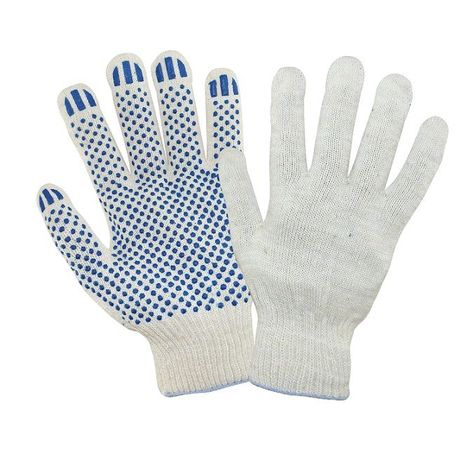 Перчатки универсального применения для защиты рук от общих производственных загрязнений и истирания. Пряжа изготовлена из хлопка с добавлением полиэстровой (полиэфирной) нити, увеличивающей прочность перчаток. ПВХ покрытие "Точка" улучшает сцепные свойства перчаток.